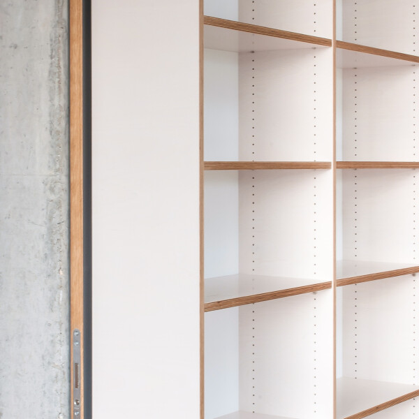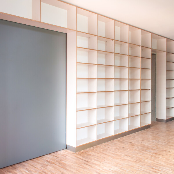 Wir haben dafür ein 7 m langes Einbauregal gefertigt, in dieses wurden 2 Durchgänge integriert.