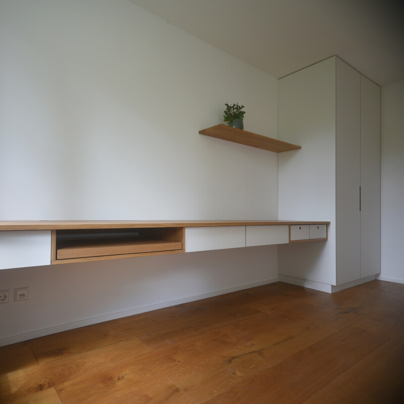 Der 3,3 m lange Schreibtisch ist ohne Füsse realisert und hängt zwischen Schrank und Wand.