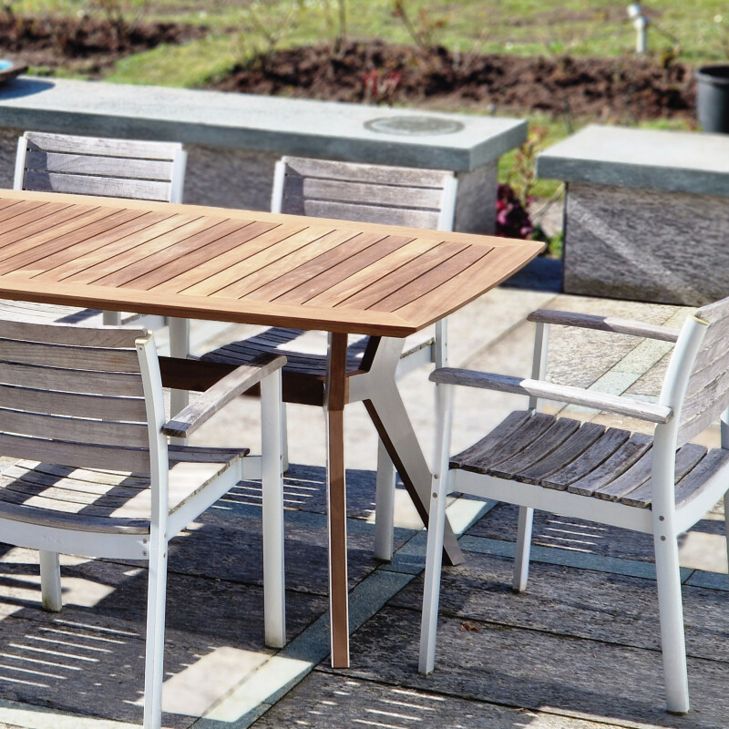 KALLE ist die wetterfeste Neuinterpretation unseres bewährten Tischmodells LINUS – jetzt für den Einsatz unter freiem Himmel. Das gebürstete Edelstahlgestell trifft auf Kebony, eine nachhaltig behandelte Kiefer mit der höchsten Dauerhaftigkeitsklasse. So entsteht ein eleganter, langlebiger Tisch für draußen.