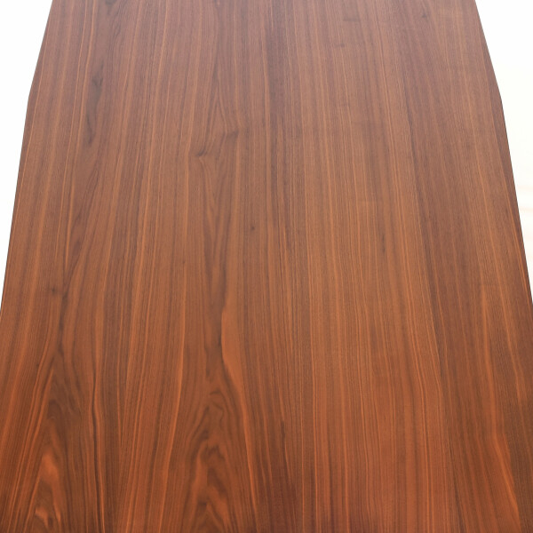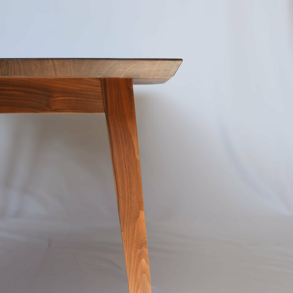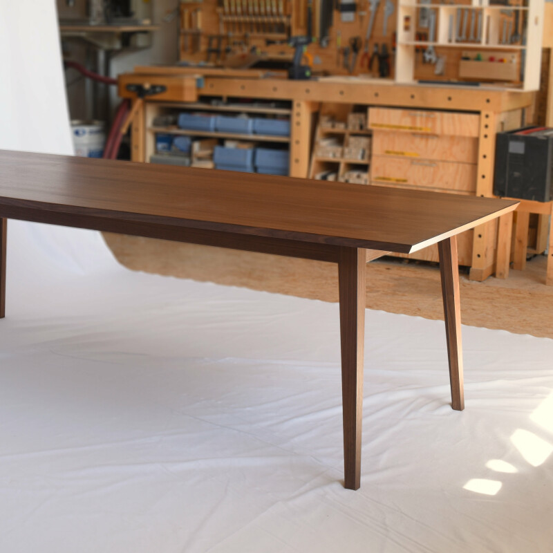 Fertigung eines eleganten Esstisches aus Nussbaum mit in der Mitte konvexer Form, Verjüngung an den Kopfenden.