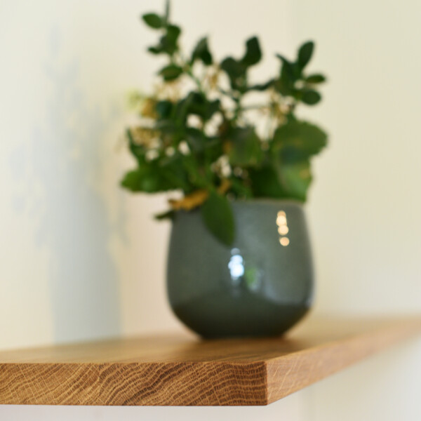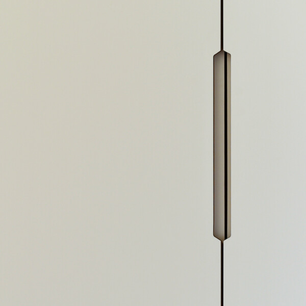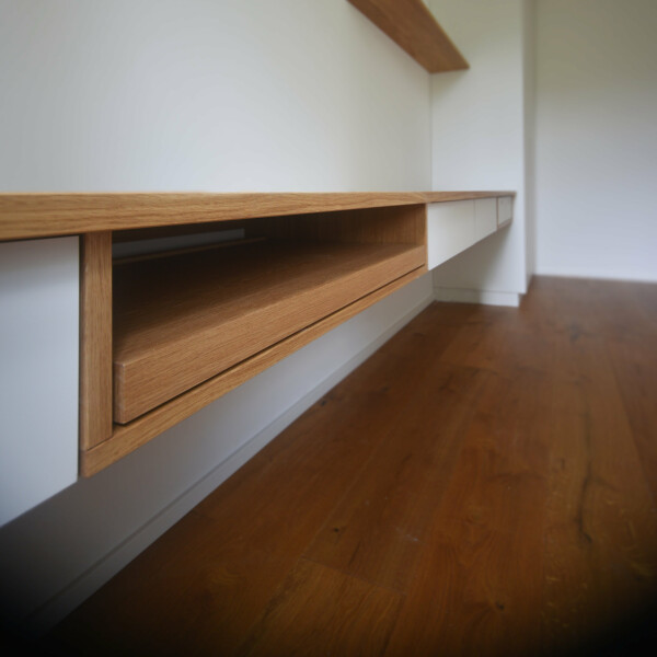 Aufwendiges Griffdetail mit eingefrästen Griffen und mit weißen Eichplättchen hinterlegt.