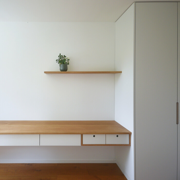 Ein raumhoher Schrank lässt aller Ordner verschwinden. Im rechten Bereich sind die verstellbaren Fachböden zurückgesetzt um ein Geschenkpapierhalter an der Tür montieren zu können.