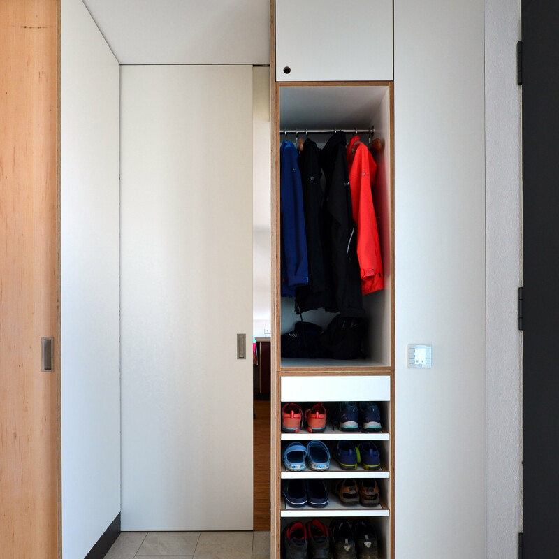 Ganz rechts eine offene Garderobe und Schuhauszügen für die meistgenutzten Schuhe.