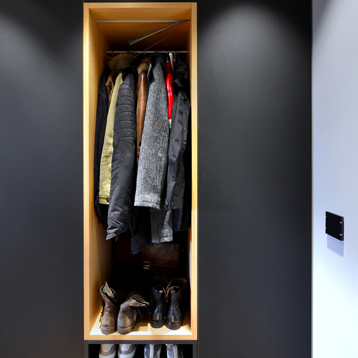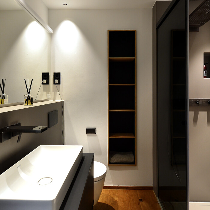 In die raumhohen Großformatfliesen wurden 4 in die Wand eingelassene Regale mit Klappen gefertigt, innen beleuchtet.