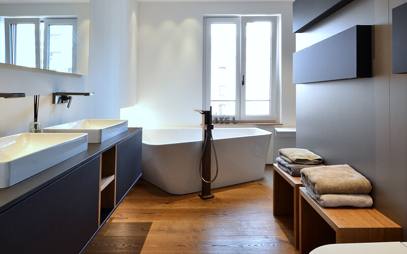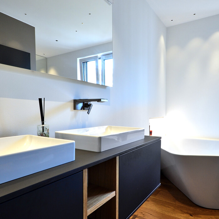 Waschtisch kombiniert Fenix " Nero " mit Eiche Massivholz, offener Bereich mittig bricht die strenge Form.