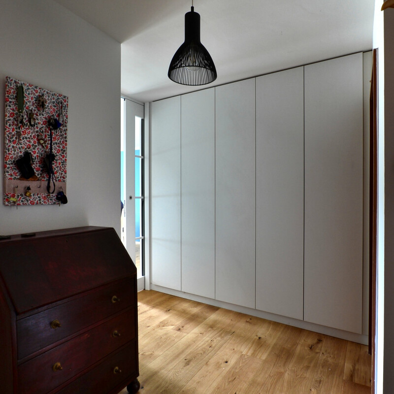 Schräger Einbauschrank on Wohnungsflur, schliesst ehemalige Türöffnung und leitet ins Wohn - und Esszimmer.