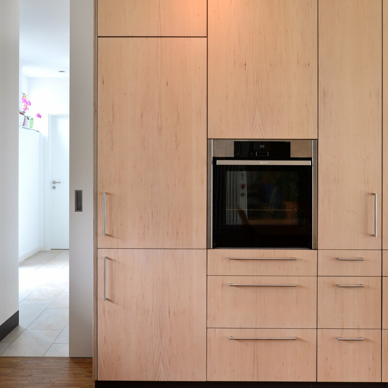 Die Hochschränke trennen Flur von Küche und integrieren nebenbei die wirklich raumhohen Schiebetüren.