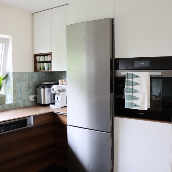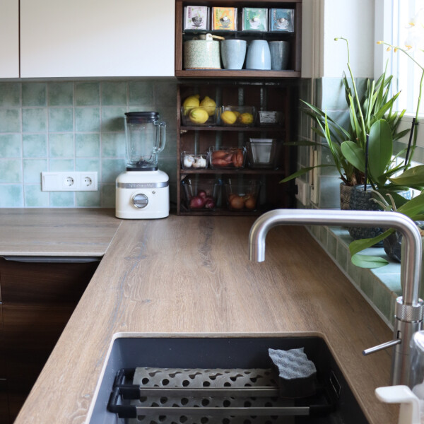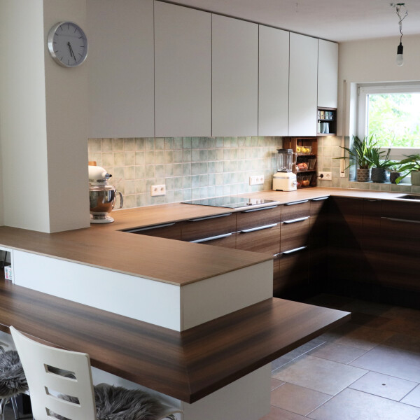 Zusätzlicher Stauraum in Sockelschubkästen, Integration eines Quooker auf kleinstem Raum und das durchlaufende Furnier sind nur als einige Highlights zu nennen.